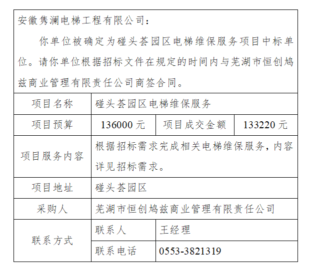 碰頭薈園區(qū)電梯維保服務(wù)采購(gòu)結(jié)果公告